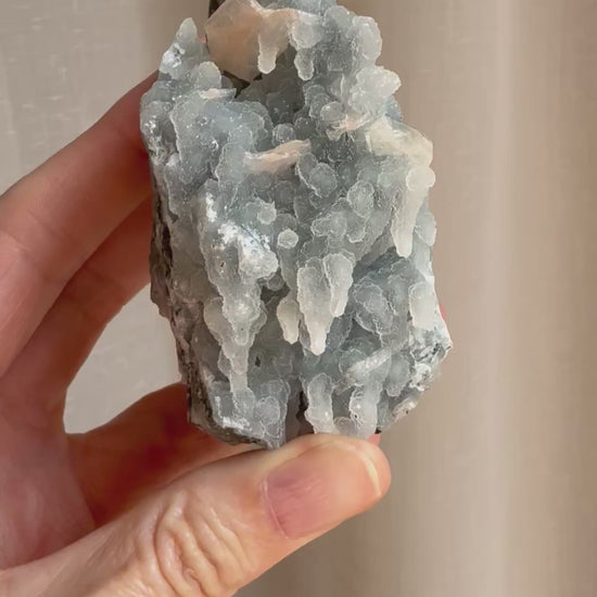 Chalcedony alleviates negative thoughts and emotions, and transforms them into feelings of joy. It encourages one to show kindness and compassion towards others. It is also believed to heal issues related to the circulatory system, bones, and eyes.