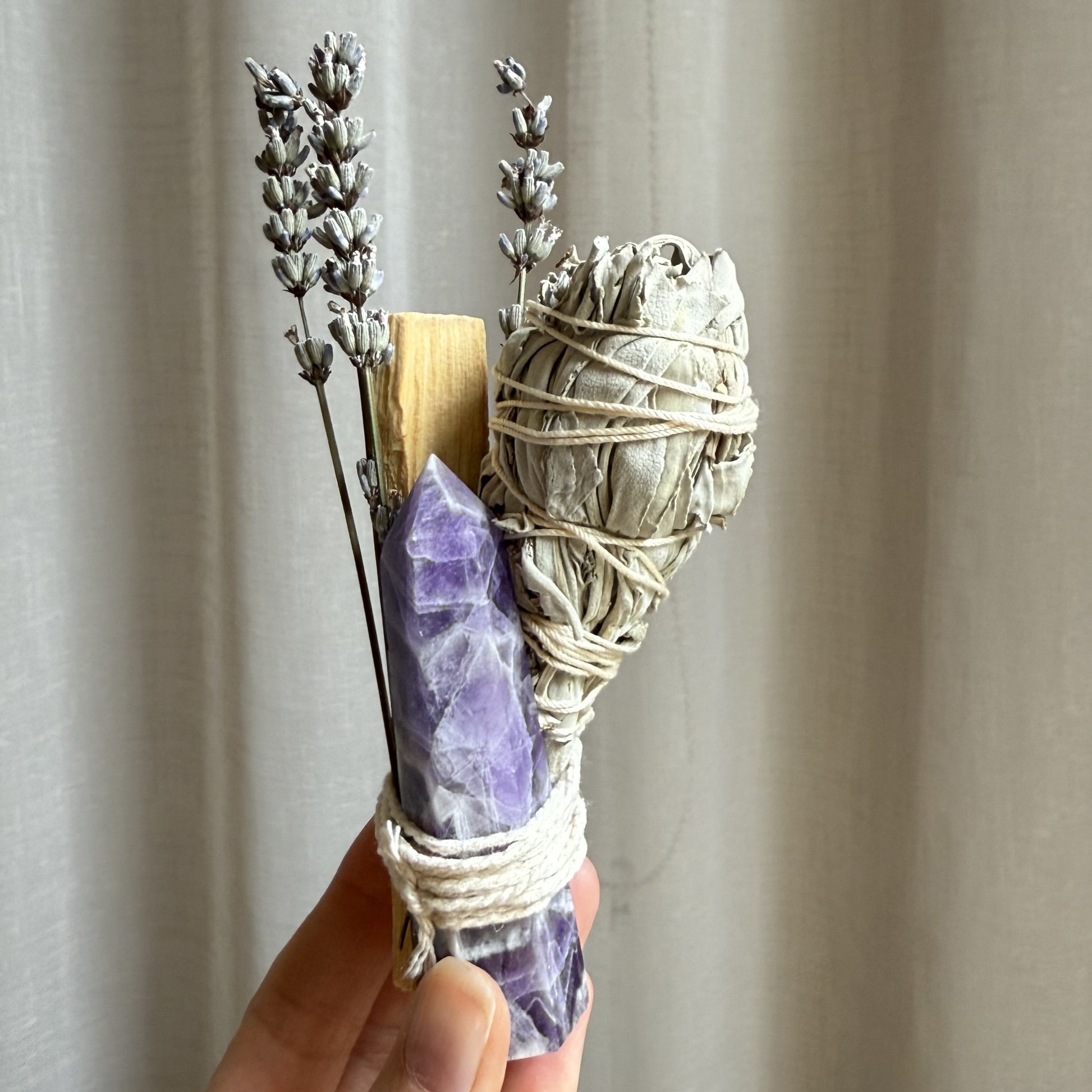 Pack contains 1 x Palo Santo Stick, 1 x White Sage Smudge Stick, Dried Lavander, 1 x Intuitively Chosen Tourmaline Quartz Tower