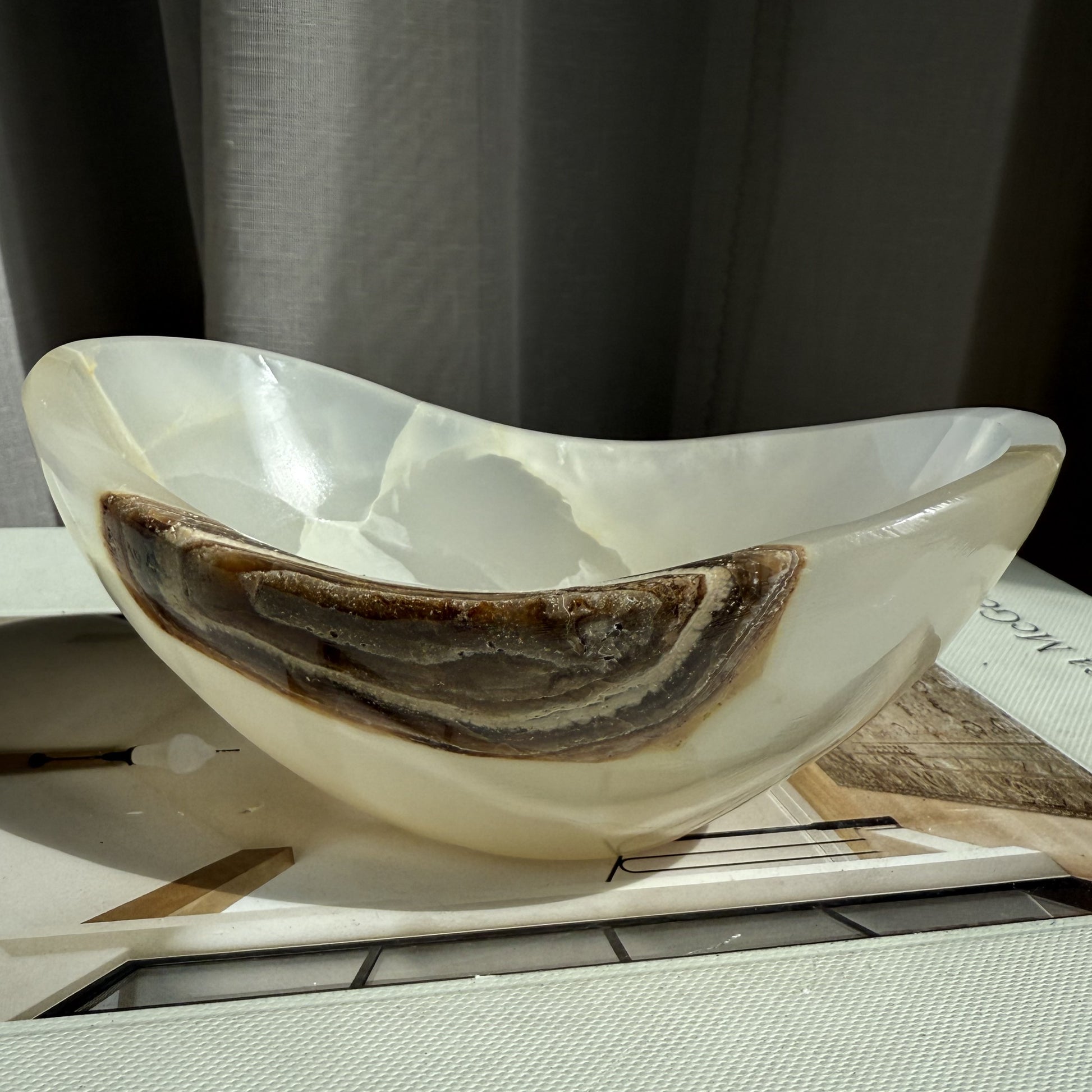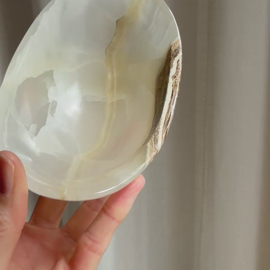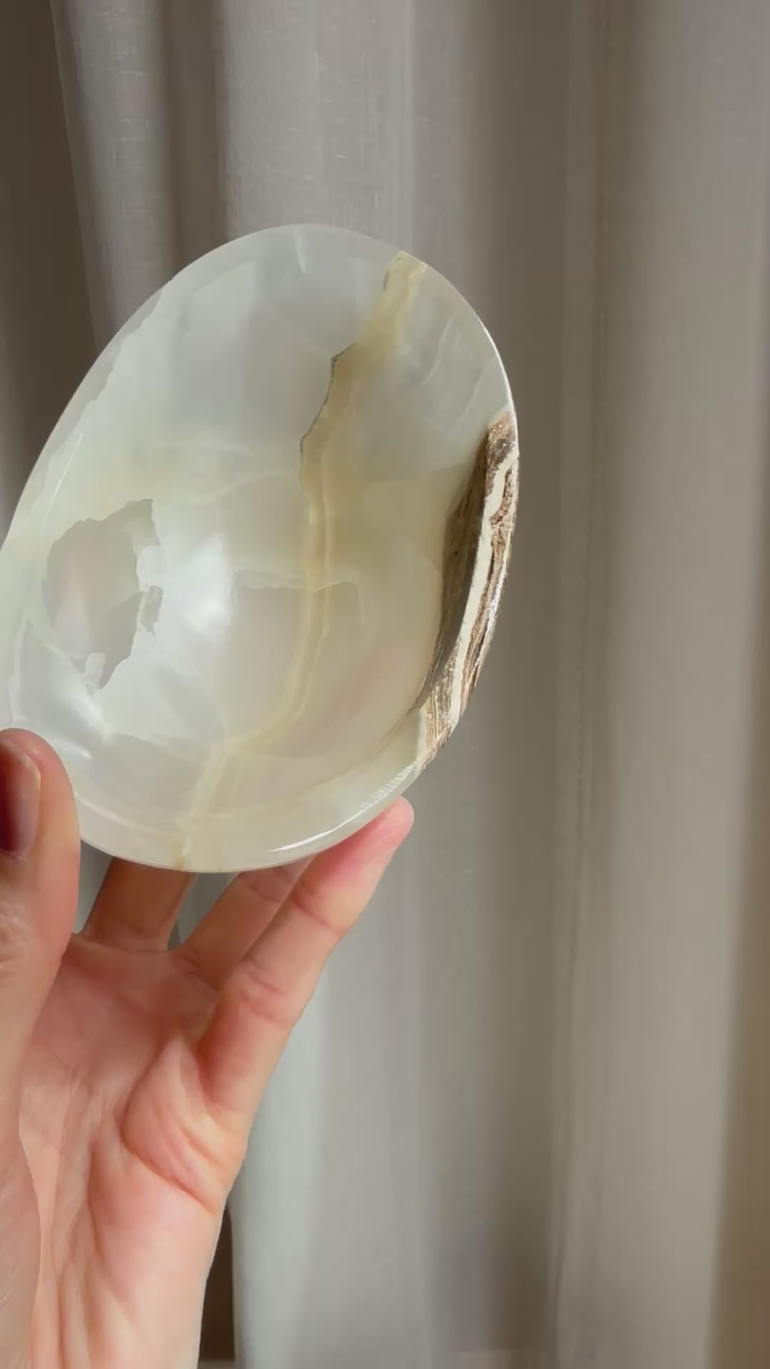 Our Onyx bowls are simply stunning. Creamy white and semi translucent this bowl sits lightly in any interior. Perfect displayed by itself or for those special items such as Jewellery or crystals.