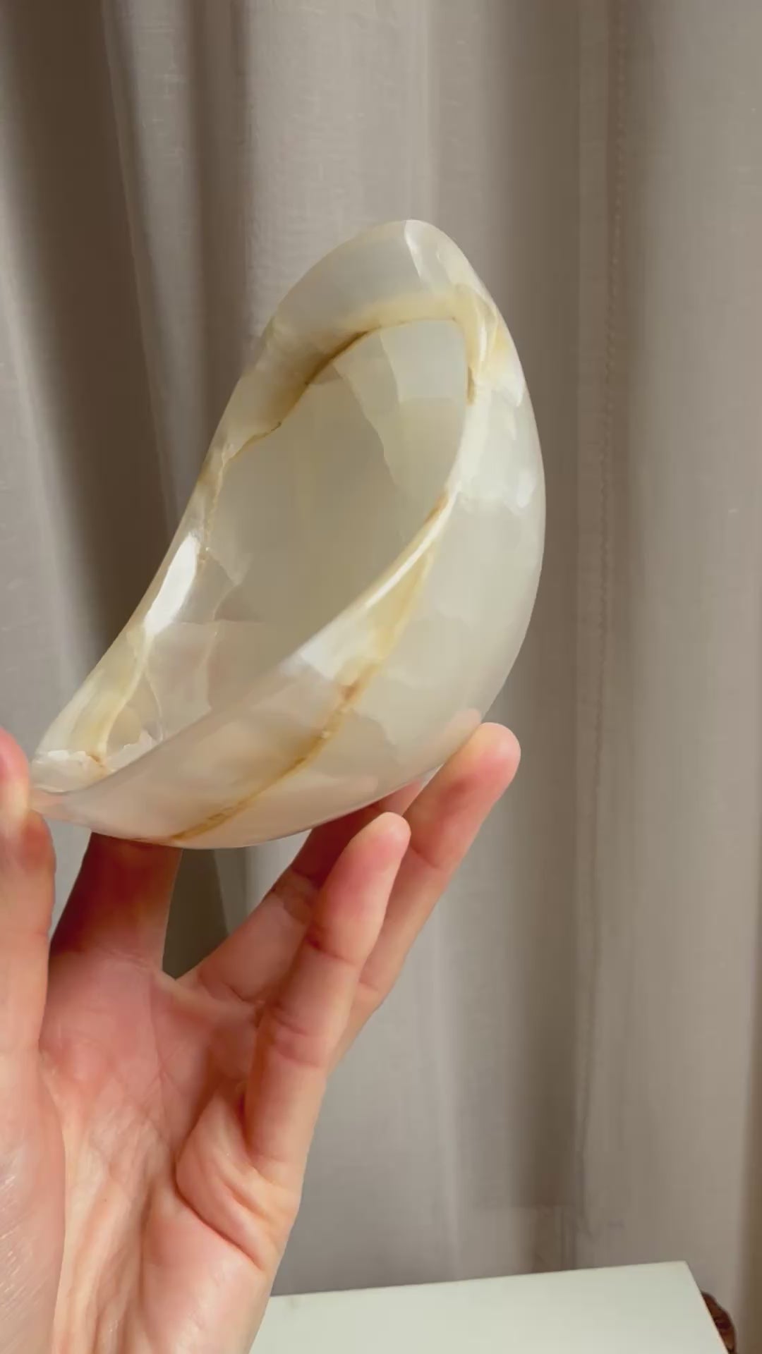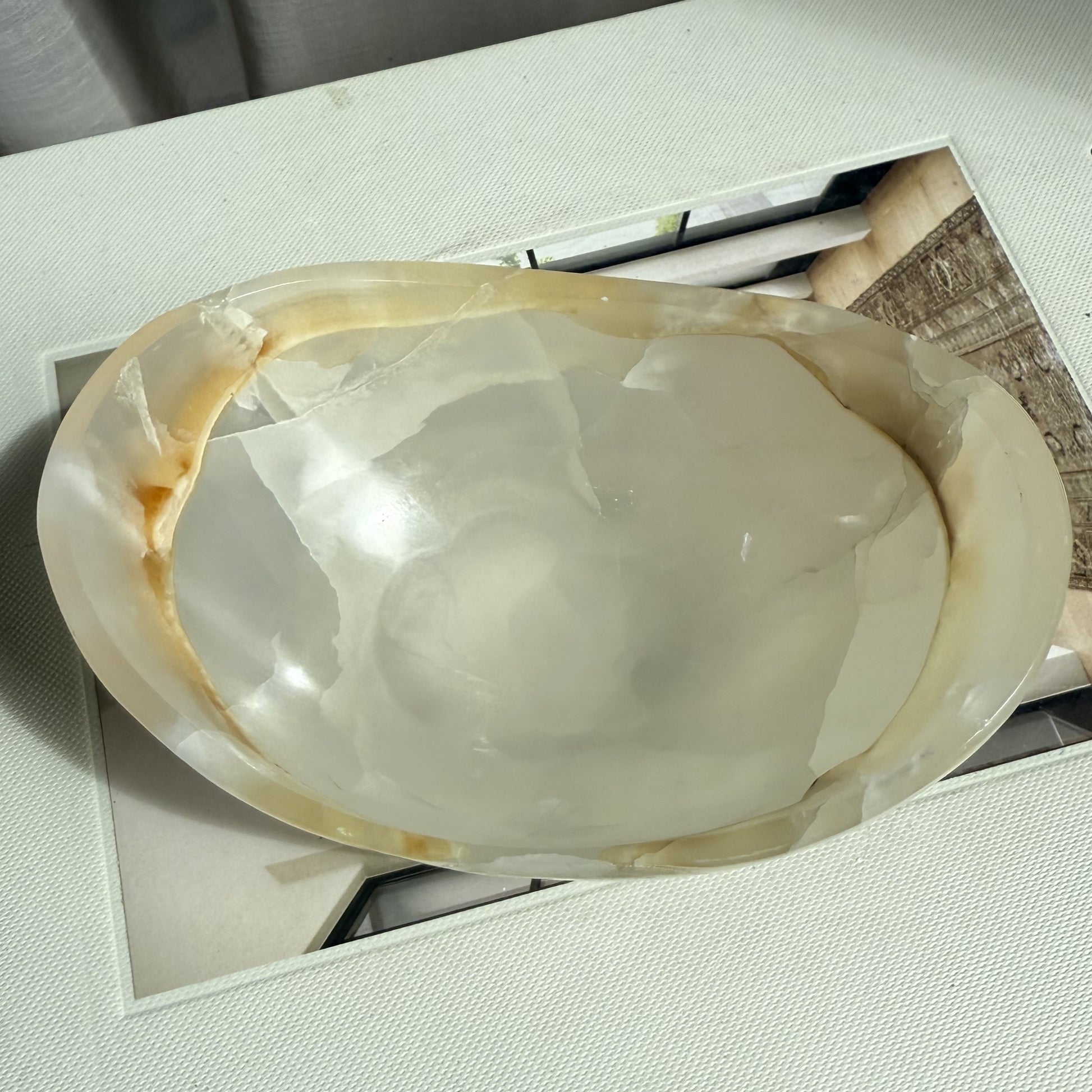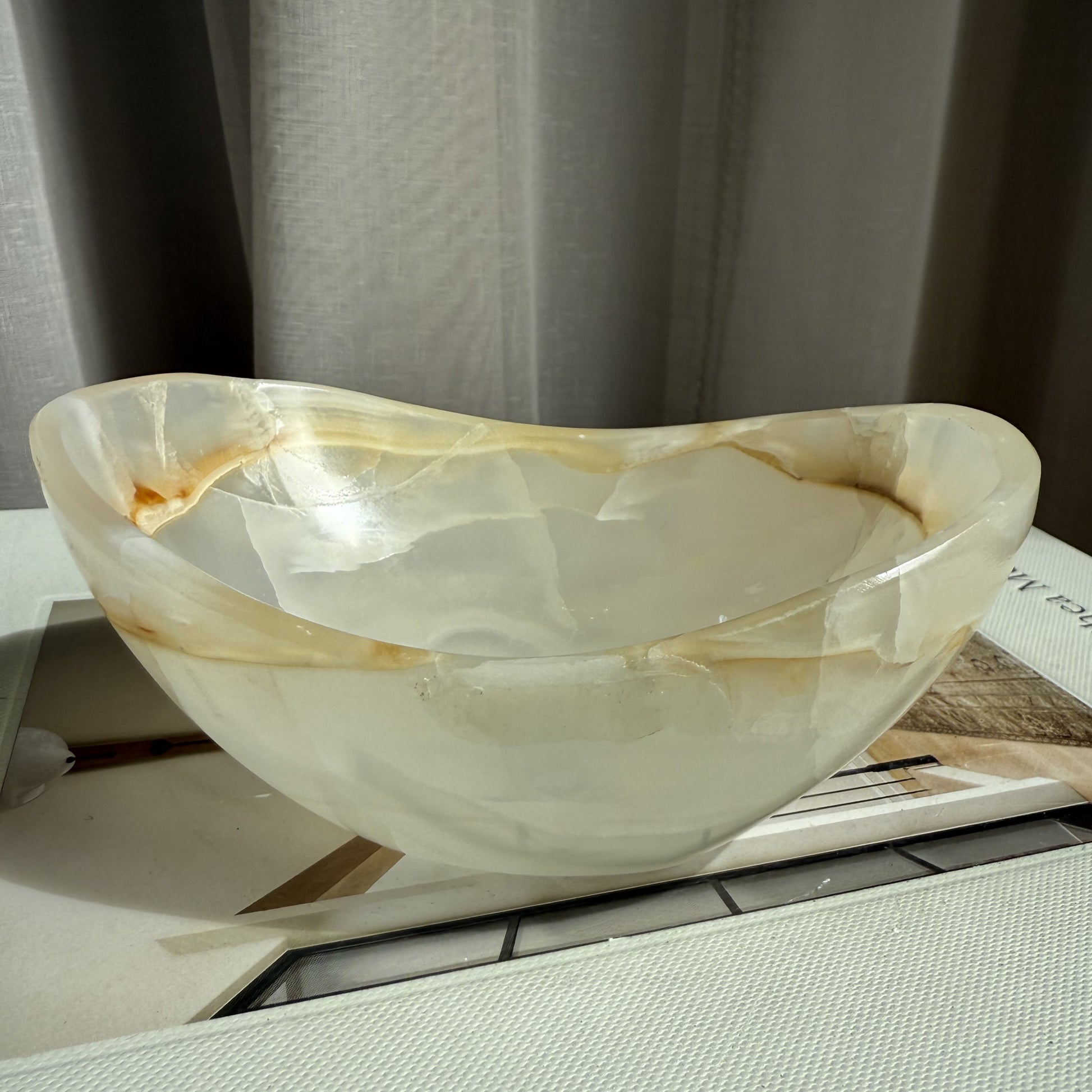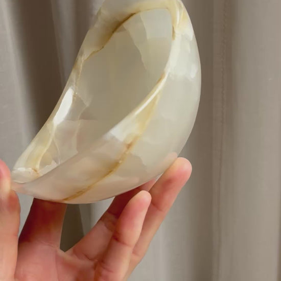 Our Onyx bowls are simply stunning. Creamy white and semi translucent this bowl sits lightly in any interior. Perfect displayed by itself or for those special items such as Jewellery or crystals.