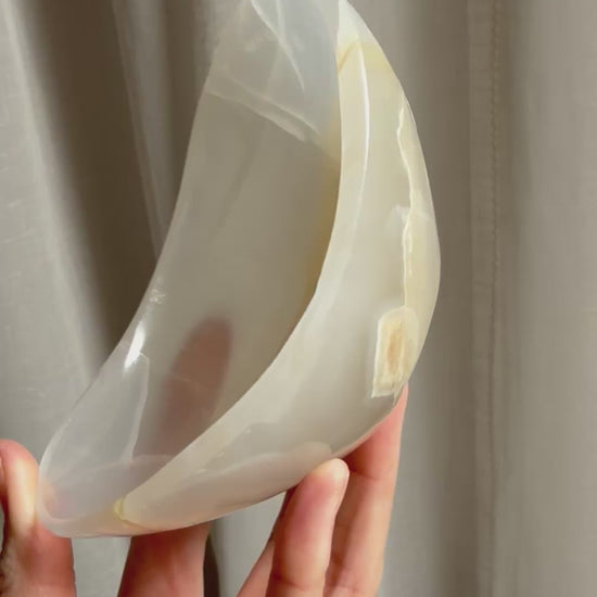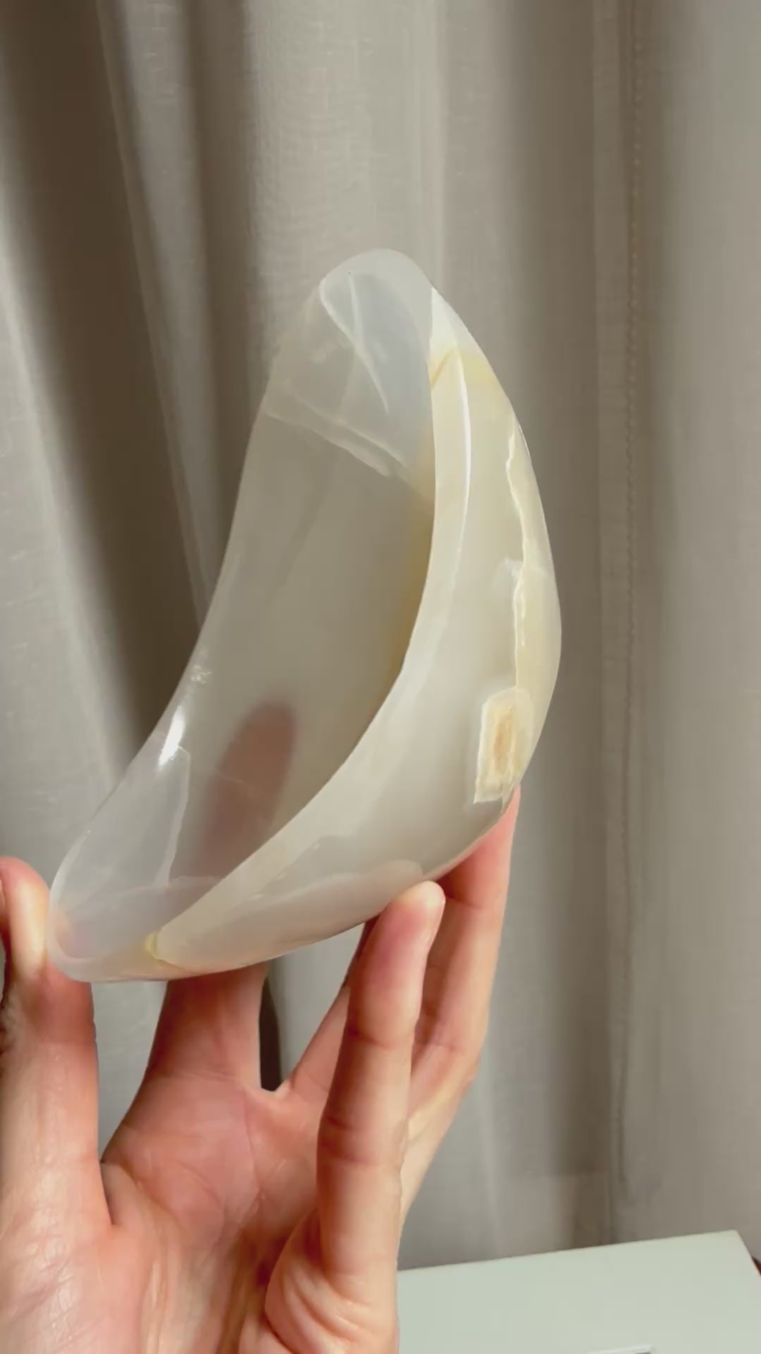 Our Onyx bowls are simply stunning. Creamy white and semi translucent this bowl sits lightly in any interior. Perfect displayed by itself or for those special items such as Jewellery or crystals.