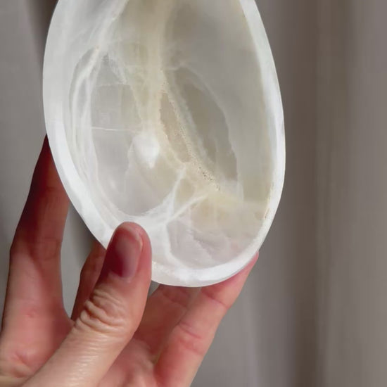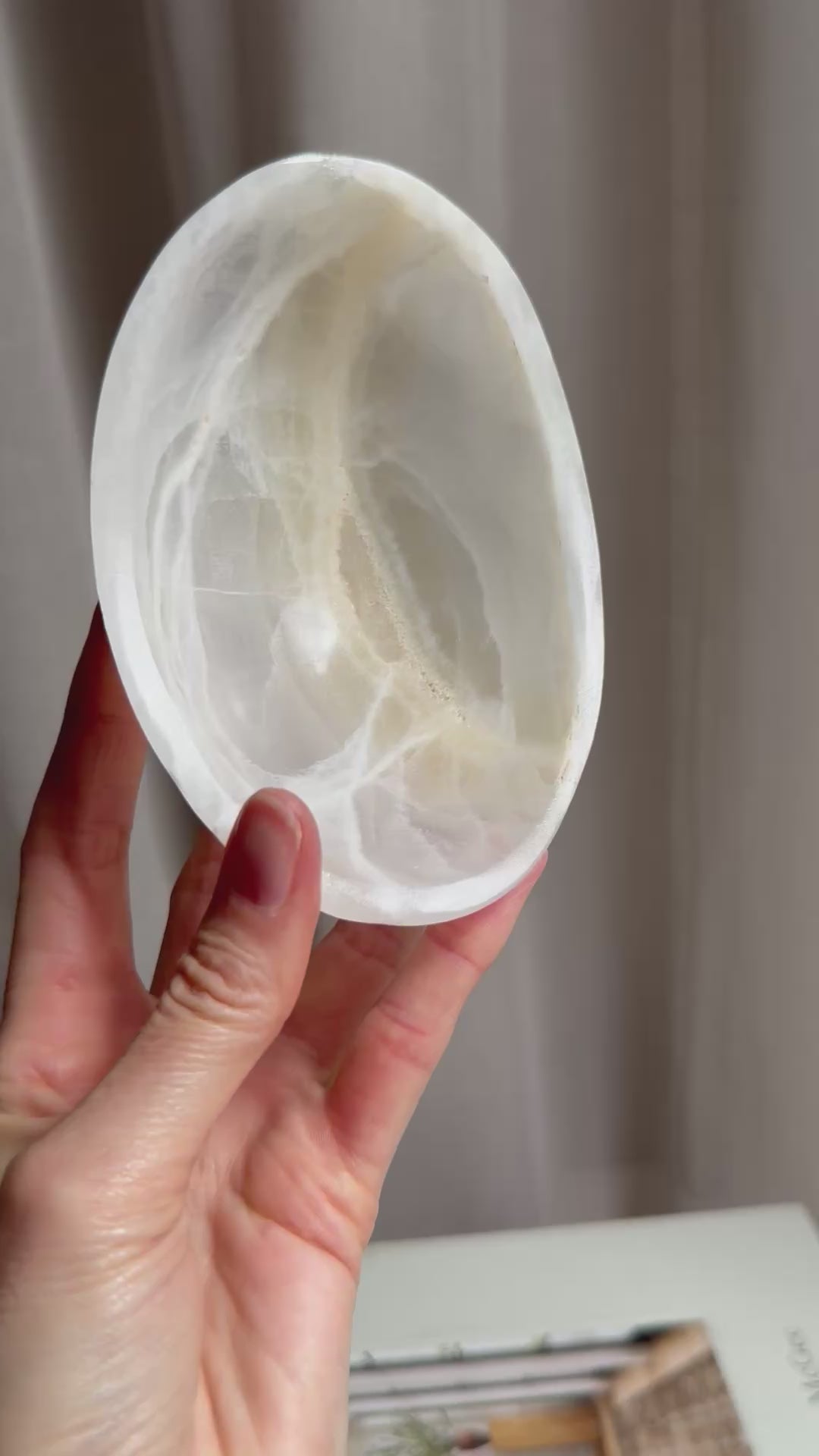 Our Onyx bowls are simply stunning. Creamy white and semi translucent this bowl sits lightly in any interior. Perfect displayed by itself or for those special items such as Jewellery or crystals.