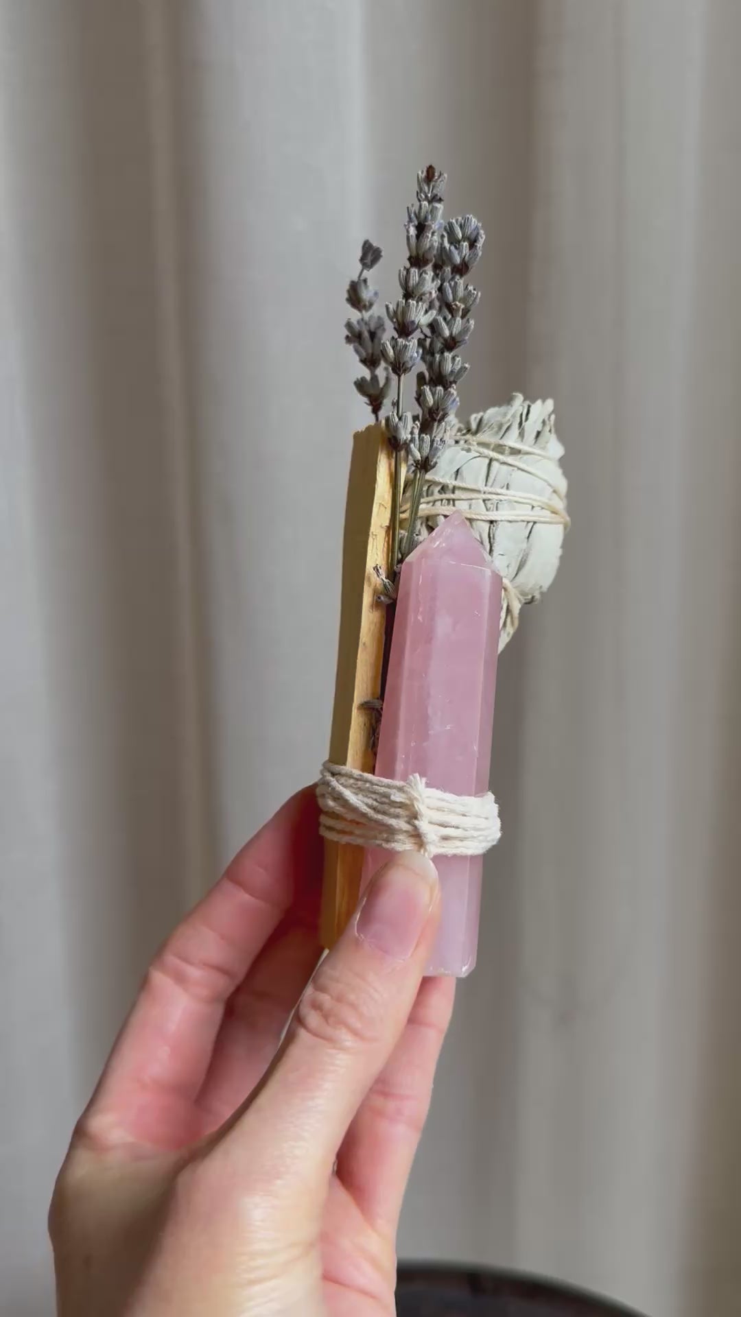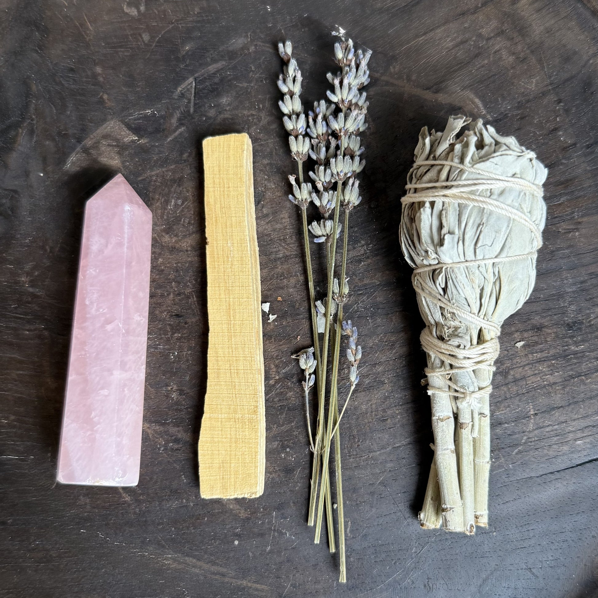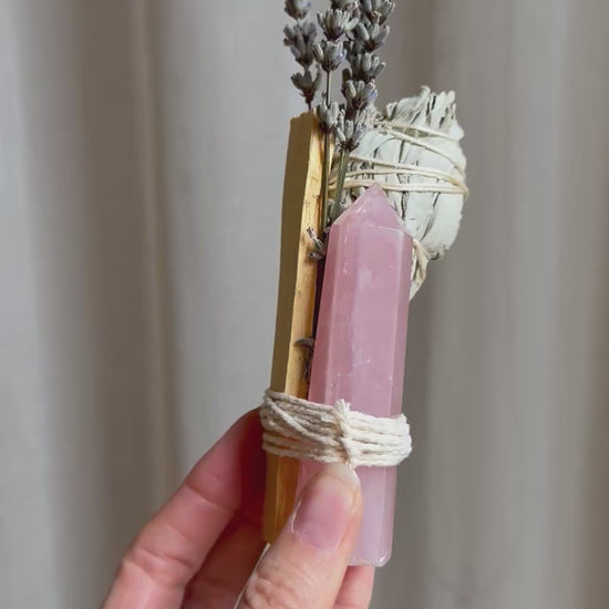 Pack contains 1 x Palo Santo Stick, 1 x White Sage Smudge Stick, Dried Lavander, 1 x Intuitively Chosen Tourmaline Quartz Tower